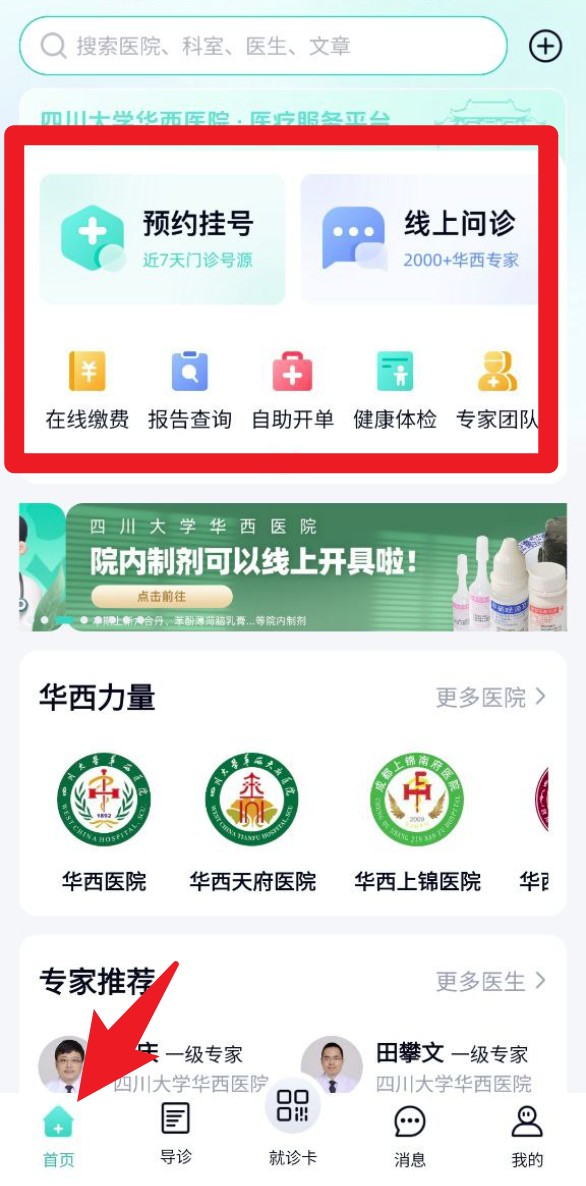 1. 在首页点击下方的首页按钮,即可查看预约挂号、报告查询等主要功能入口,满足就医前期操作需求。