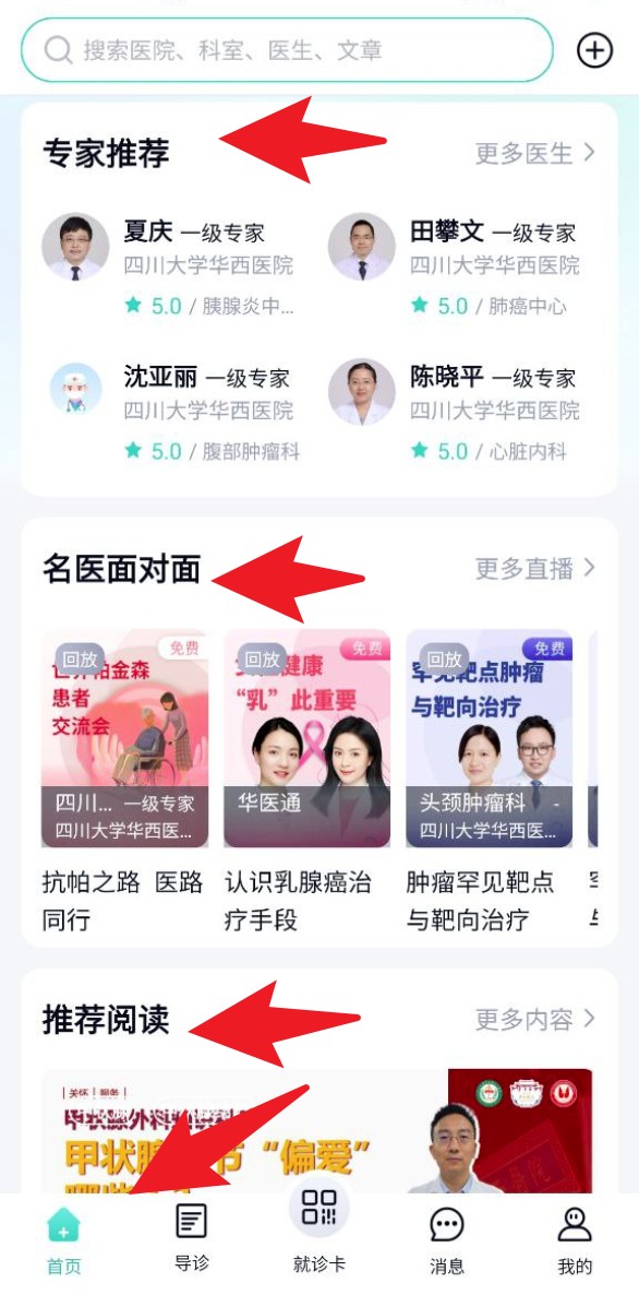 2. 下滑可查看专家推荐、名医面对面、推荐阅读等模块,快速获取专业医生信息和最新医学资讯内容。