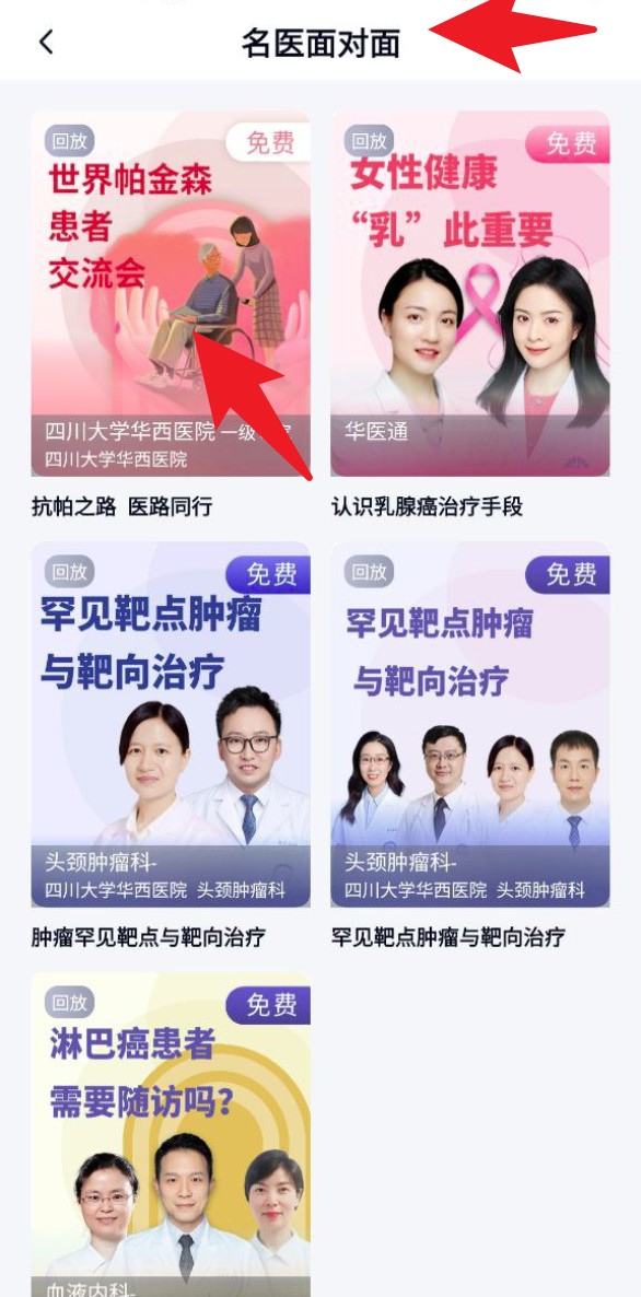 3. 点击名医面对面模块中的任意讲座卡片,可进入专题页面,查看相关医学讲座内容,支持回放功能。