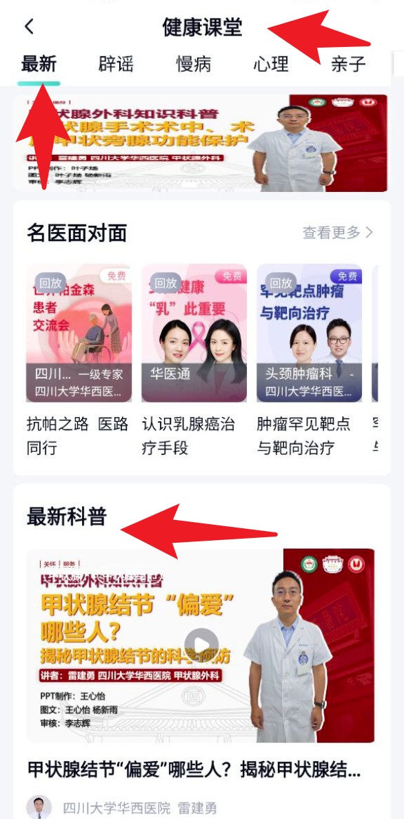4. 进入健康课堂后,默认显示内容分类,左右滑动顶部分类导航栏,切换查看慢病、亲子等科普专题内容。
