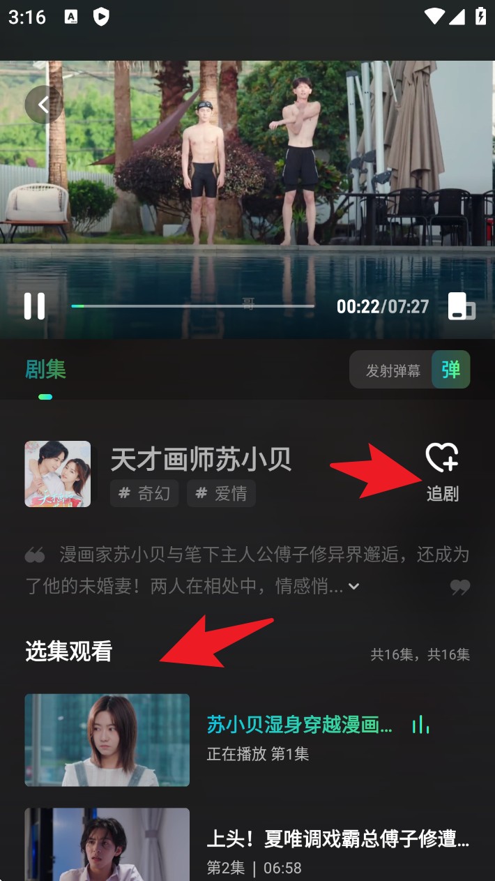 2. 播放页面下方可选择剧集并点击追剧收藏,系统将同步记录观看进度与剧集状态。