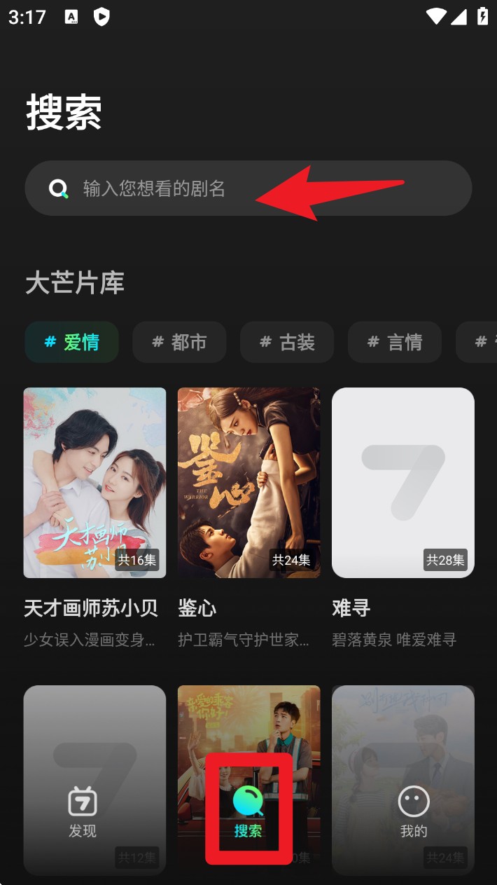 3. 点击下方搜索按钮后,在顶部输入栏中输入剧名,即可快速查找并跳转播放页。