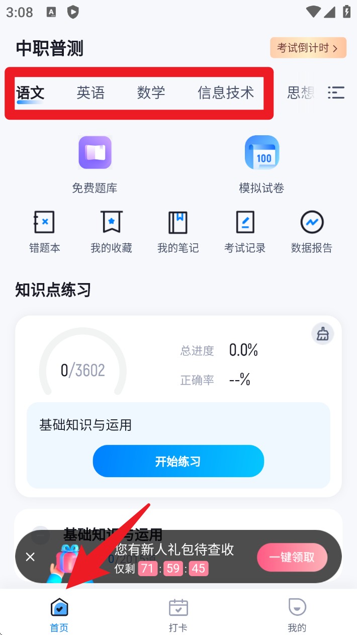 1.进入首页后,可在顶部选择科目进行练习,并使用底部功能区查看收藏、错题等辅助资料。