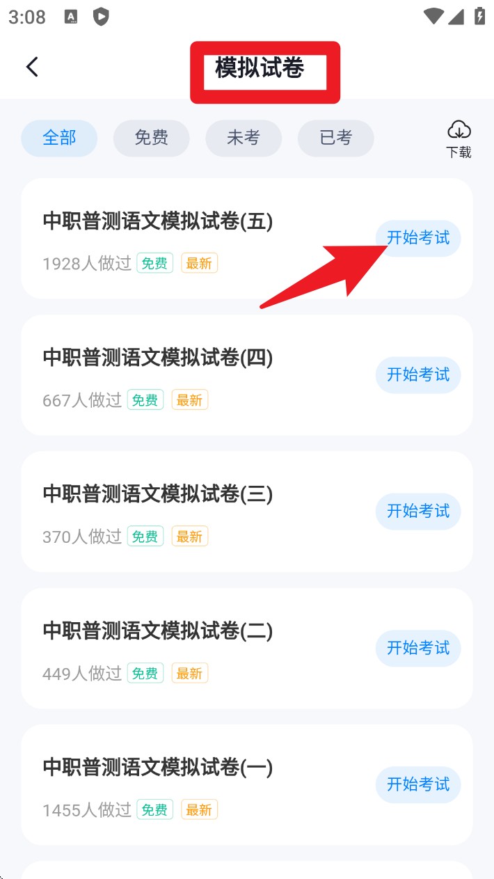 2.点击模拟试卷入口,可挑选各类模拟题进行测试,每套卷子都支持免费在线开始考试。