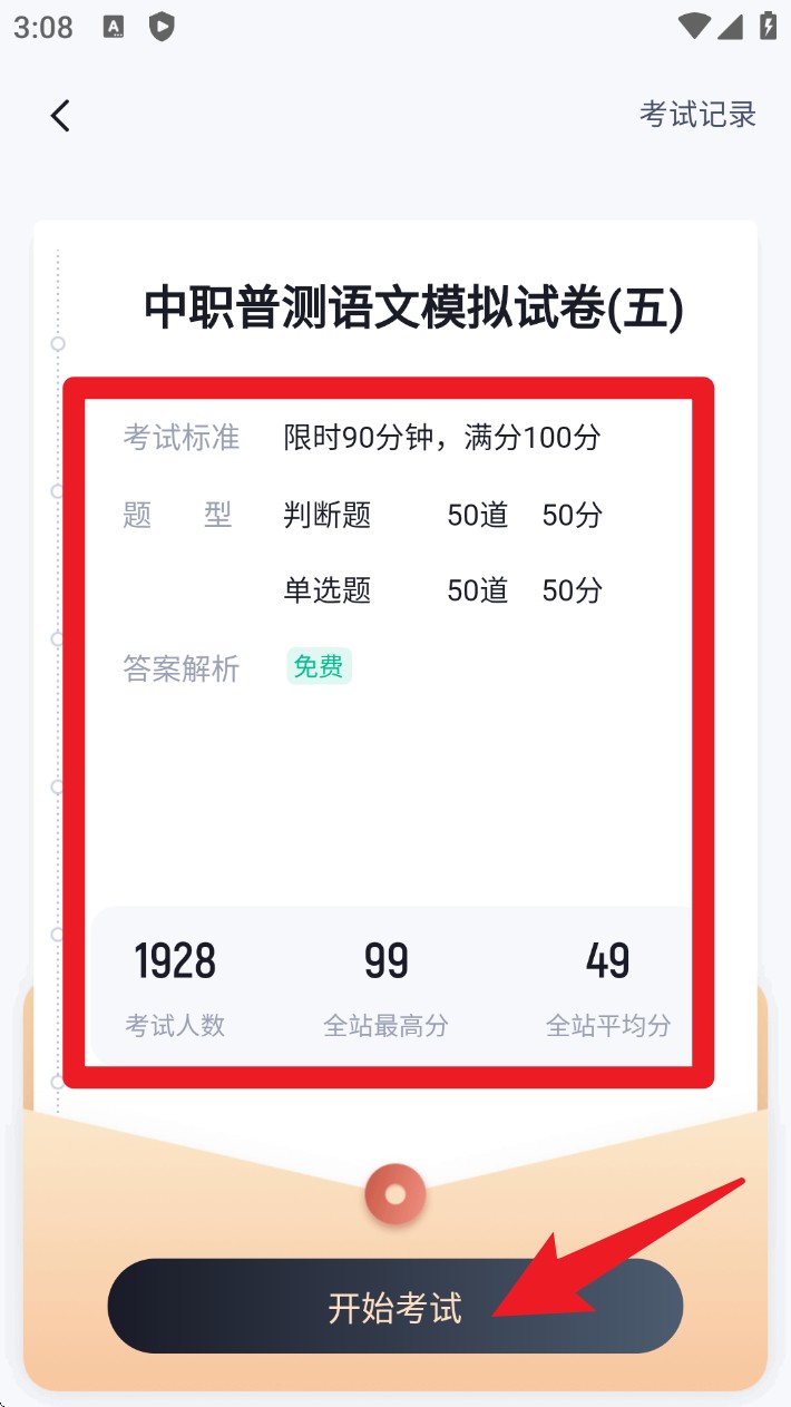 3.进入试卷详情页后,可查看考试时间、题型分值说明,点击底部按钮即可正式进入答题界面。