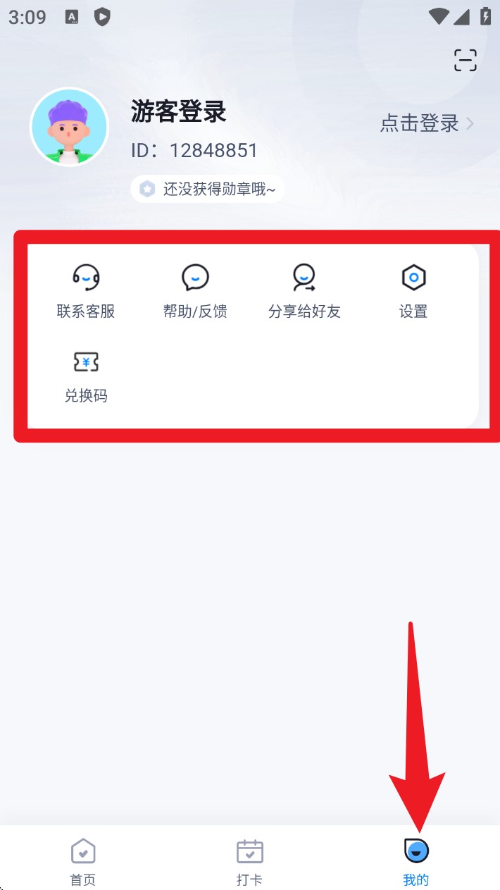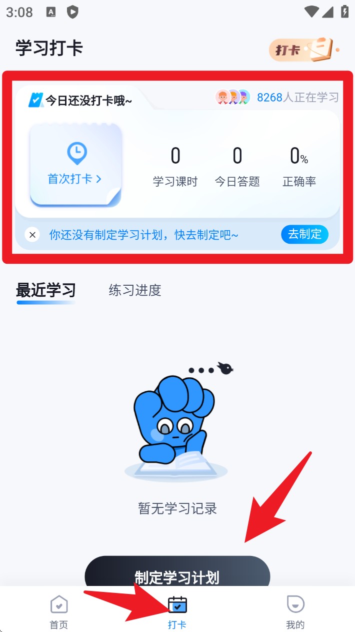 4.点击底部打卡页签,系统将自动记录每日答题与学习时长,也可自定义个人学习计划。