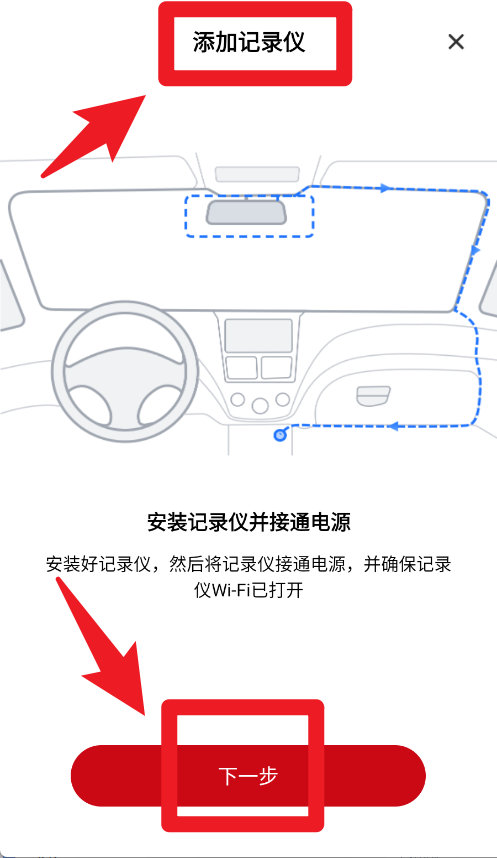 2、按照提示完成记录仪的安装并接通电源,同时确保设备的WiFi功能已开启。