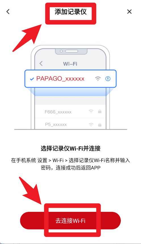 3、在手机WiFi设置中选择记录仪对应的网络名称,输入密码完成连接后返回软件。