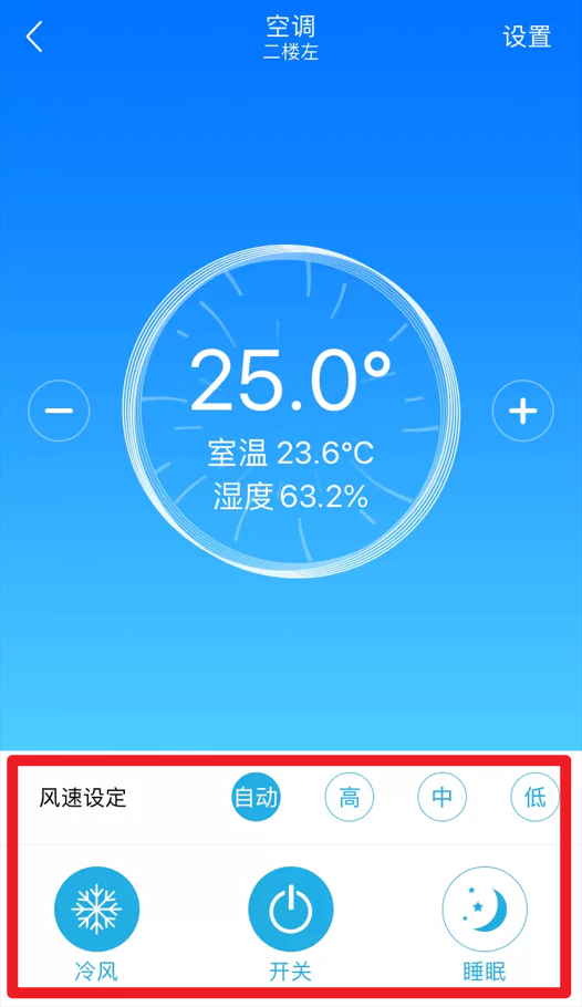 3、进入首页后可查看空调控制界面,支持实时调节温度和风速模式,点击冷风、睡眠即可实现个性化设置。