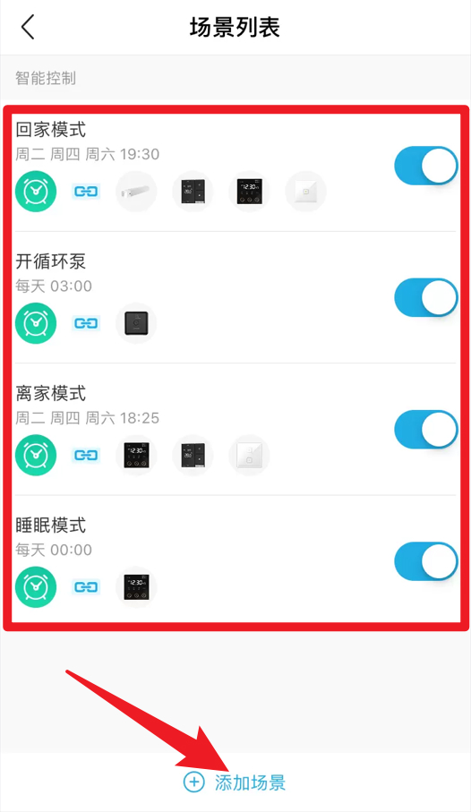 5、用户可在场景列表中查看所有已设置的模式,如开循环泵等,灵活开启或关闭,保持家庭环境的舒适和高效。