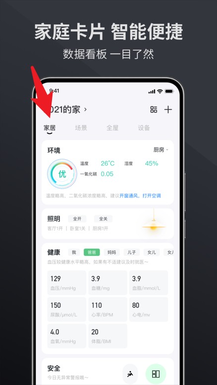 3、主页的家居模块展示家庭环境数据与健康信息,用户可直观查看温湿度、空气质量及家庭成员健康状况。