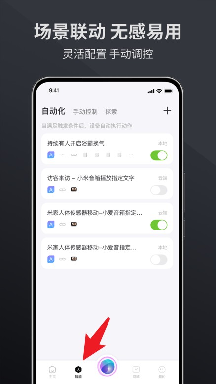 4、点击底部智能按钮可进入自动化场景联动配置,轻松设置多设备智能联动规则。