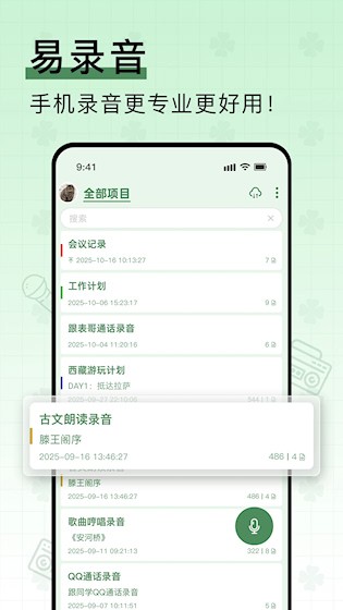 易录音是一款功能全面、操作便捷的录音应用,具备不限时长的高质量录音,适用于会议、课堂、采访等多种场景,提供后台录音、通话录音、音频格式转换等功能,可以通过标签分类管理录音文件,能启用隐私锁保护敏感内容。