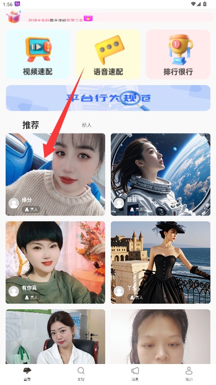 3、系统首页会展示智能推荐的匹配用户,点击感兴趣的头像查看完整资料。