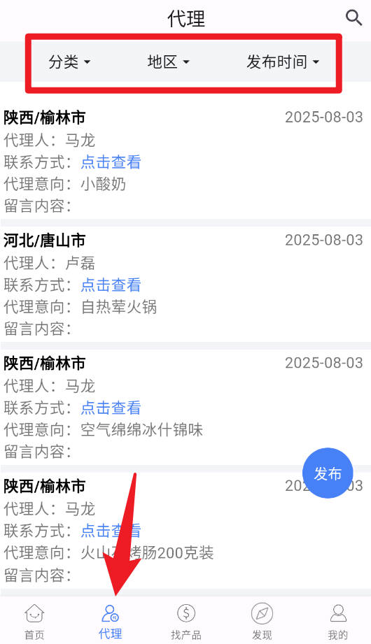 2、代理页面,可根据发布时间筛选信息,精准查找代理需求,轻松获取代理商联系方式,方便高效对接合作机会。