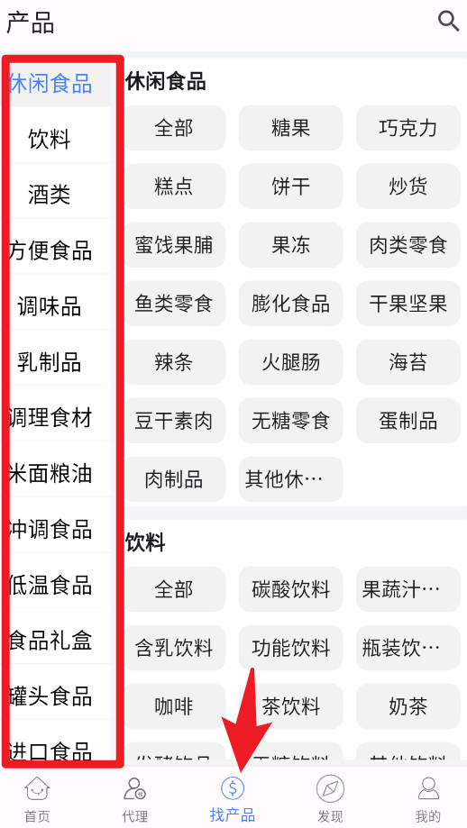 3、找产品页面,用户能按休闲食品等多种类别浏览,支持快速切换子分类,满足不同采购需求,提高选品效率。