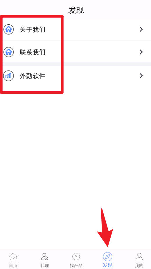 4、发现页面,可进入关于我们、联系我们及外勤软件等功能模块,便于用户了解平台信息、联系官方支持。