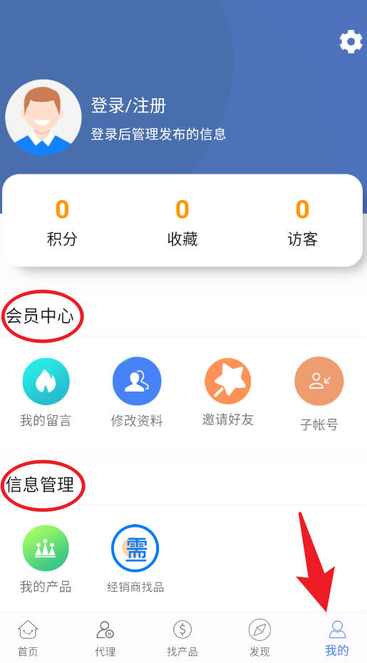 5、我的页面,用户可登录管理积分、收藏、访客信息,并可进入会员中心及信息管理,快速管理个人资料。