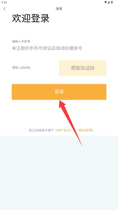 2、在登录页面输入手机号和验证码,勾选同意相关条款后点击登录进入应用。