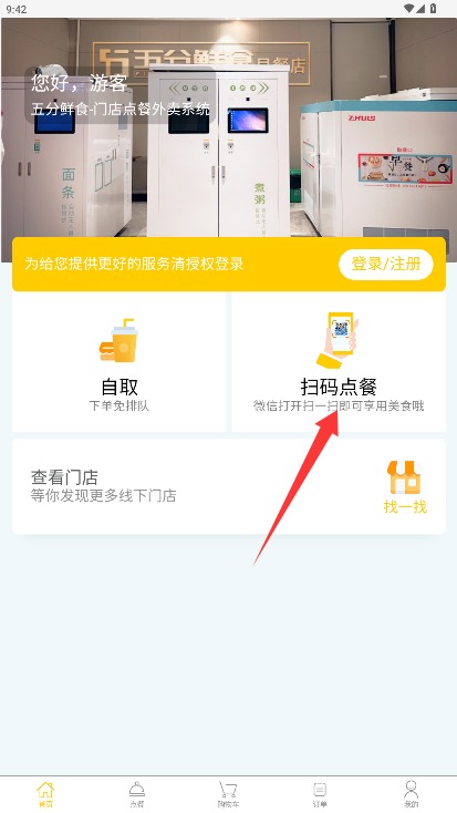 3、成功登录后进入首页,点击扫码点餐功能扫描餐厅提供的二维码获取电子菜单。