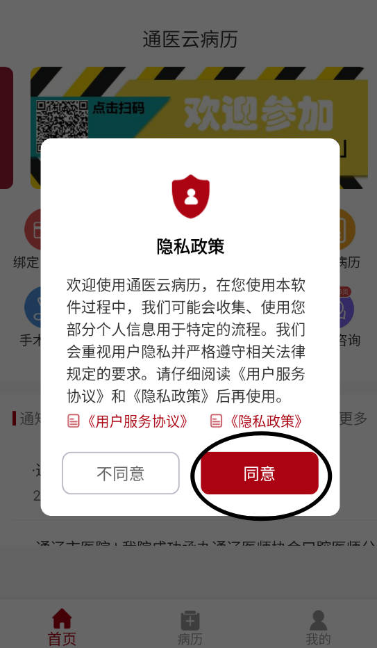 3、病历界面需输入手机号和密码,并勾选同意《服务协议》和《隐私政策》,确保用户个人隐私。