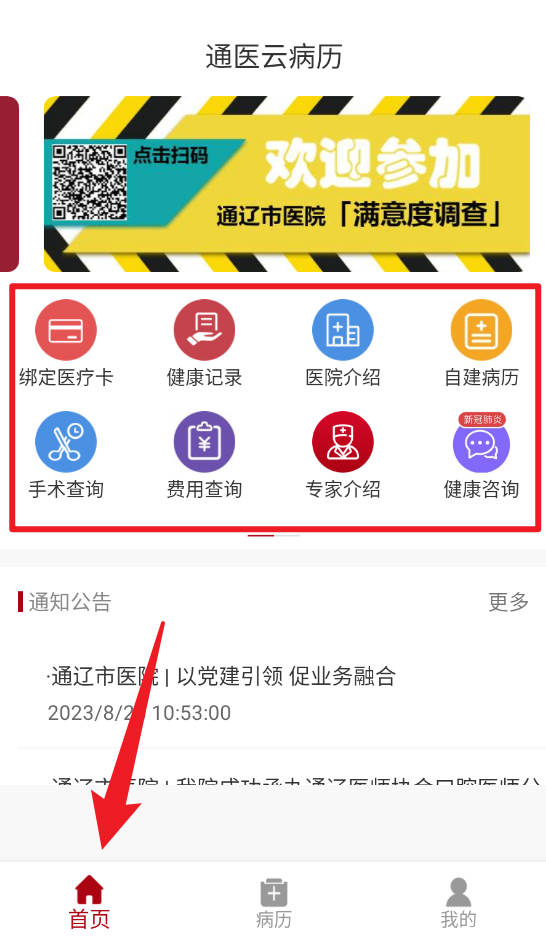 2、在首页界面,可以通过点击绑定医疗卡功能按钮,快速进入对应的医疗健康服务,实现便捷的线上信息查询。