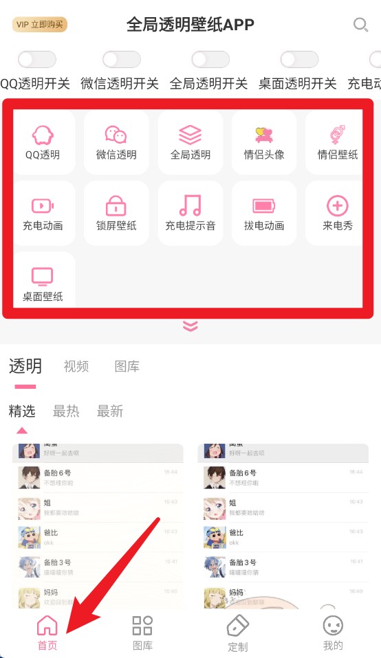 1、首页中可快速开启背景透明、微信透明、全局透明等多种功能,点击图标即可进入对应设置。