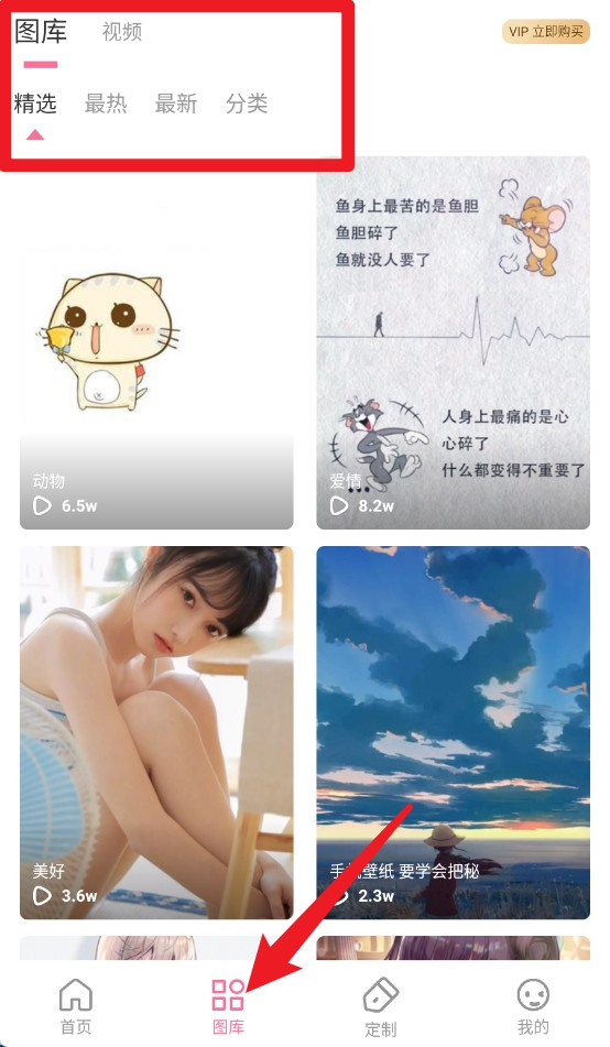 3、图库页面提供精选图片与视频分类,支持按最热、最新等标签筛选,浏览体验更加便捷。