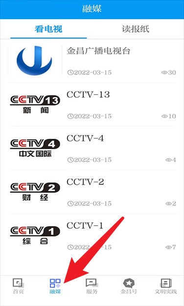 2、点击下方融媒按钮,可观看金昌广播电视台及多个央视频道,提供多元化电视直播服务。