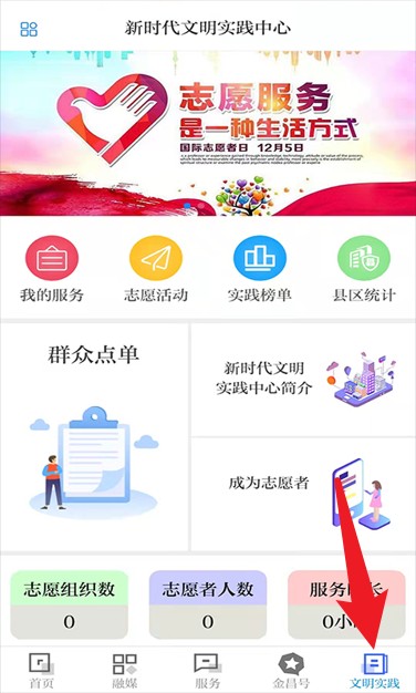 4、进入文明实践模块可参与志愿服务活动、查看志愿者统计与服务时间,还可注册成为志愿者。