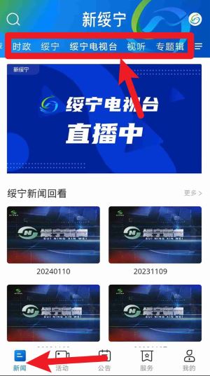 1、打开APP,点击首页底部新闻栏目可查看绥宁本地最新资讯内容,包含新闻回看与电视台直播模块。