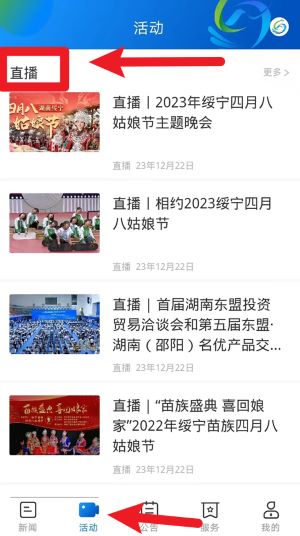 2、切换至活动页面可浏览绥宁举办的各类直播活动详情,包括节庆晚会与展会直播。