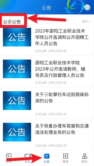 3、点击公告栏目进入公告公示页面,查看绥宁本地权威机构发布的各类政策与事务通知。