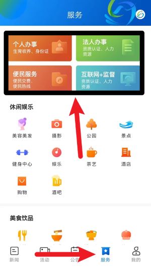 4、在服务页面中可选择个人办事、法人办事、便民服务等模块,实现本地政务线上办理。