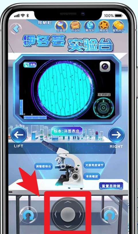 2.登录后进入实验台界面,点击屏幕底部的圆形操纵杆可调节镜头方向,进行放大或移动视角观察标本。