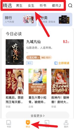 2、点击底部精选标签可浏览推荐书籍内容,并可通过顶部分类切换男女频、听书等。