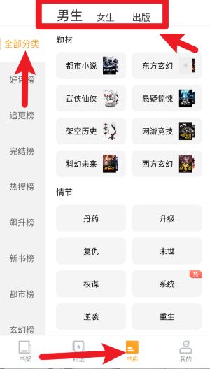 3、进入书库页面后,可根据男生、女生或出版分类浏览不同题材与类型的小说资源。