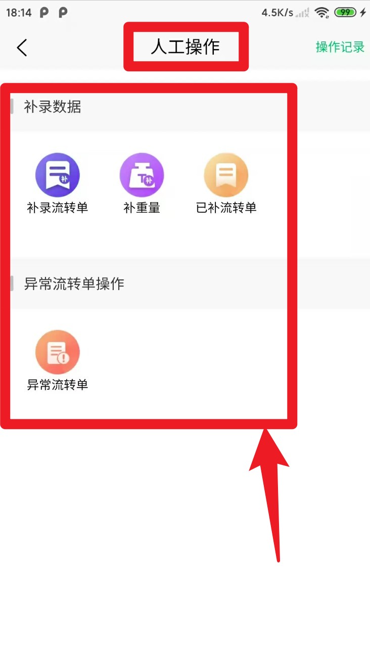2.点选人工操作按钮后进入补录界面,可手动登记补录流转单、补重量,适用于现场无法自动识别的情况。