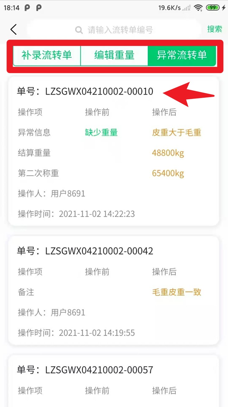 3.在异常流转单页面,选择具体单号后可查看缺少重量或皮重异常等问题,系统支持对比前后数据并记录操作时间。