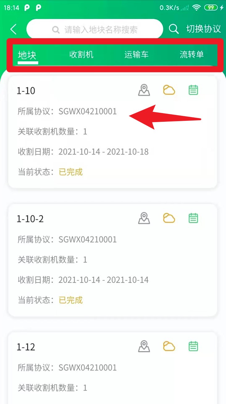 4.切换至地块标签后可查看当前协议下的各地块作业情况,包括已完成状态、收割时间与对应设备编号信息。