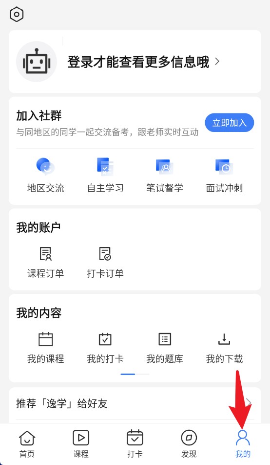 1、点击底部我的标签可查看课程订单、打卡记录与题库下载等账号内容管理。