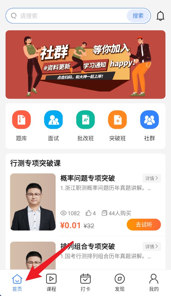 2、首页展示课程推荐、题库分类与考试项目,方便用户快速选择适合的备考内容。