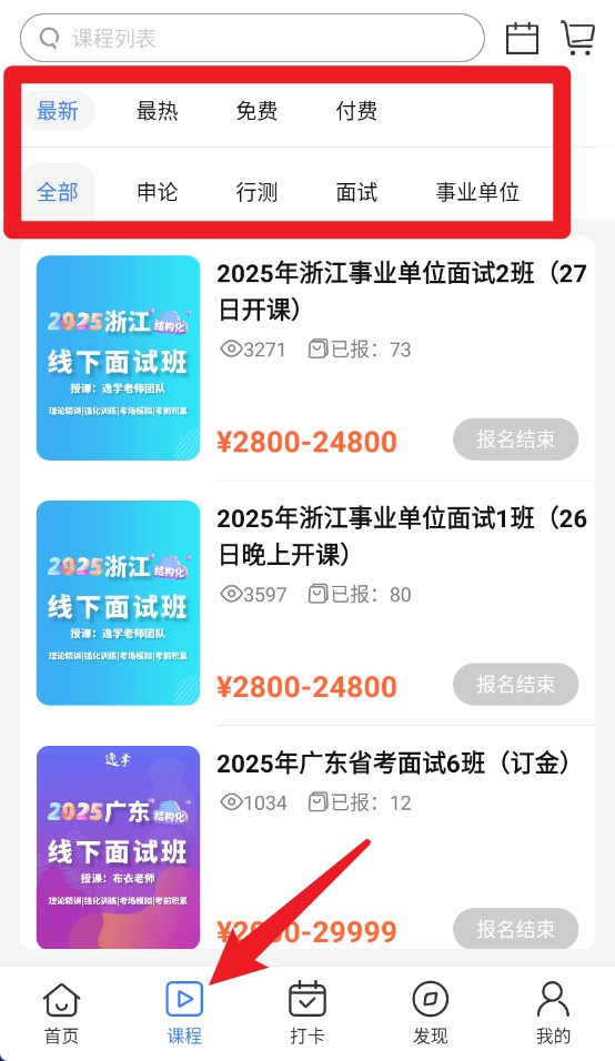 3、课程页可依照最新、热门等标签筛选,查找申论、行测、面试等各类课程。