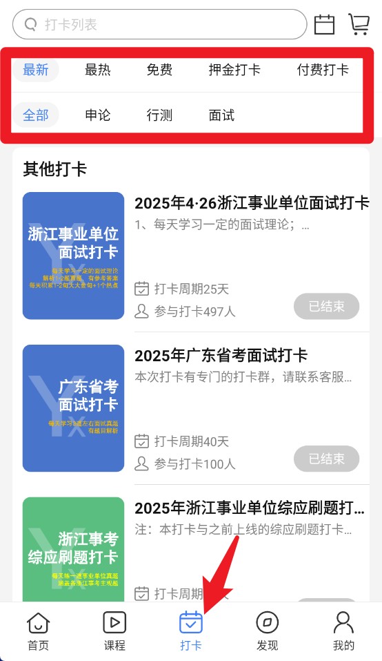 4、打卡区分类清晰,包含免费、押金打卡等多种方式,助力考生养成复习习惯。