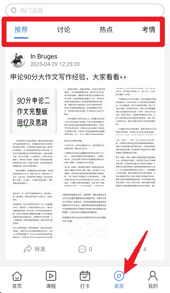 5、点击发现栏目可查看热门考情、写作经验、热点讨论与考试话题分享内容。