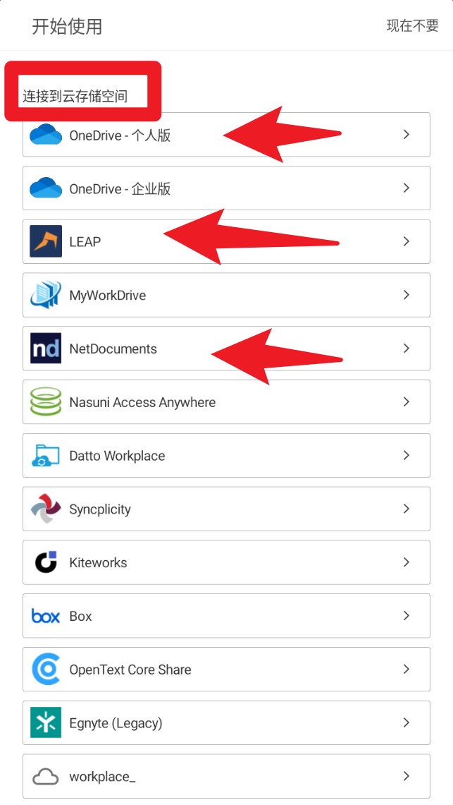 2.在弹出的云端服务列表中选择连接方式,例如OneDrive或NetDocuments等。