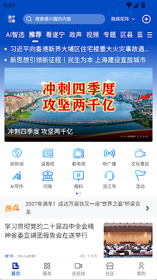 遂宁观察是一款综合移动应用,集新闻资讯、政务服务、智慧城市功能于一体,提供本地权威、及时的新闻内容,融合了短视频、直播、社区分享等形式,让信息获取直观有趣。可以通过平台了解城市动态、办理便民事务、参与公共话题讨论。