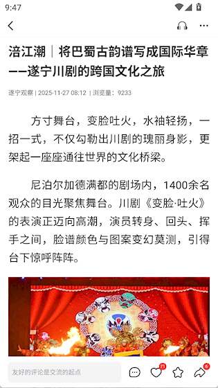1、新闻资讯全面覆盖:整合本地主流媒体资源,第一时间发布政务、社会、文化等多领域新闻,内容权威可靠,帮助用户快速掌握遂宁最新动态。