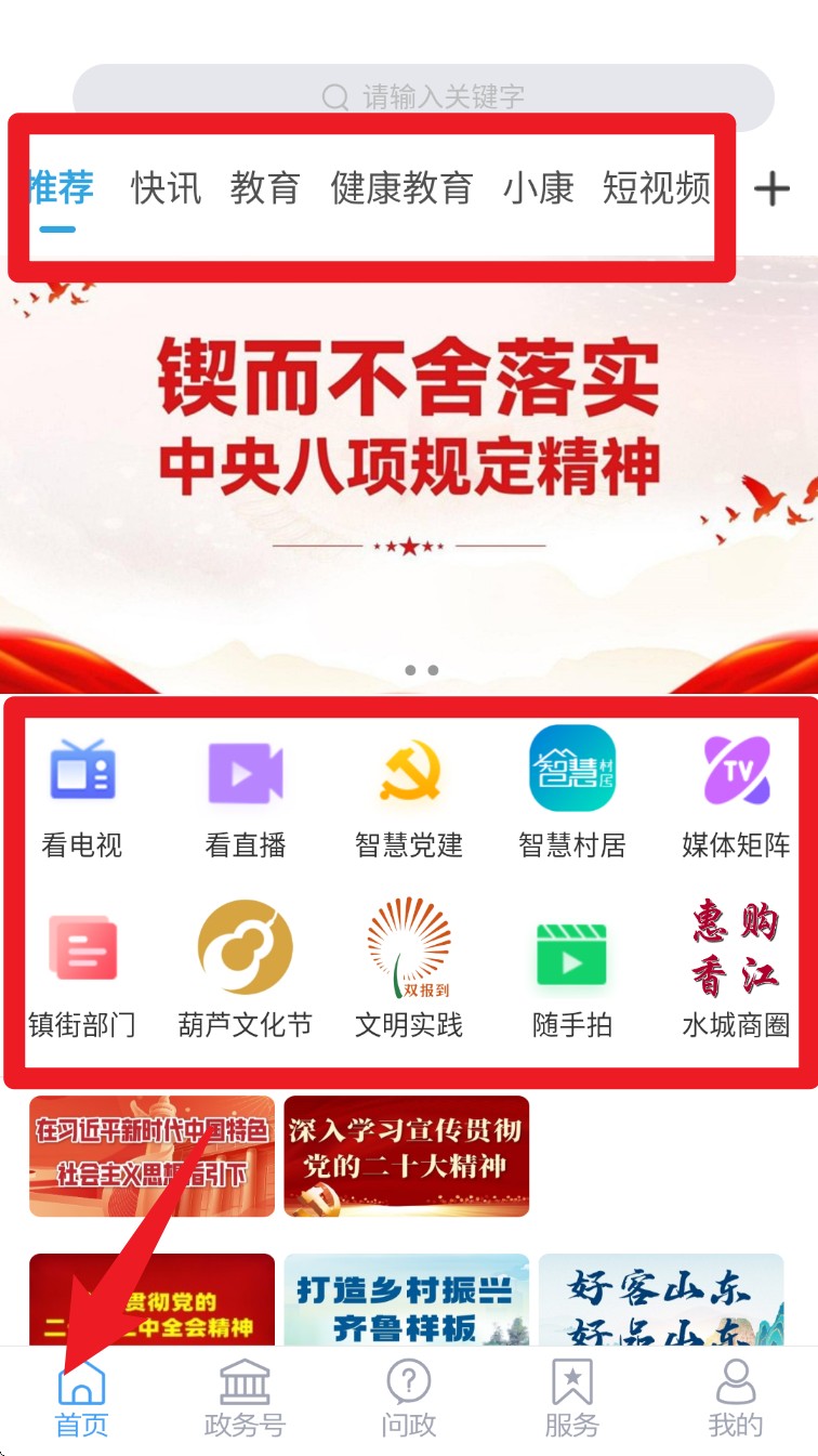 1.进入首页,点击顶部标签如快讯、教育等,浏览各类资讯内容,能在下方图标中进入电视、直播等功能区。