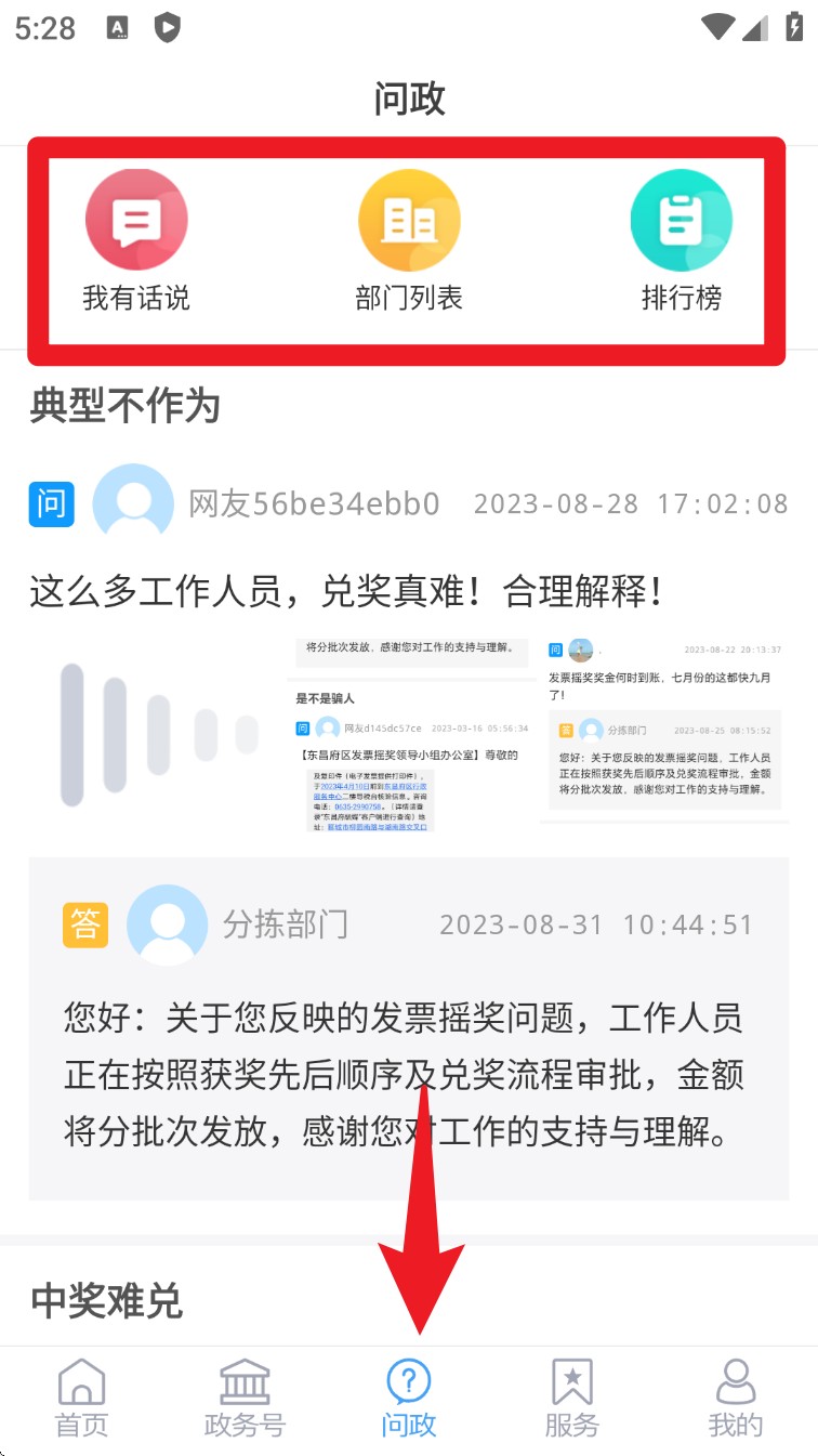 3.点击底部导航栏的问政,进入后可在我有话说里留言提问,也可以查看相关部门回复及办事进度。